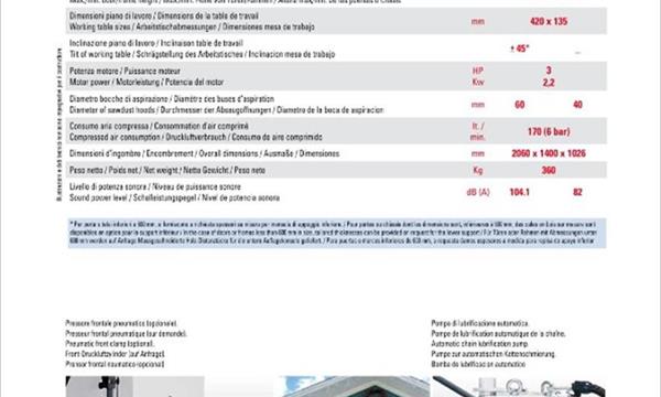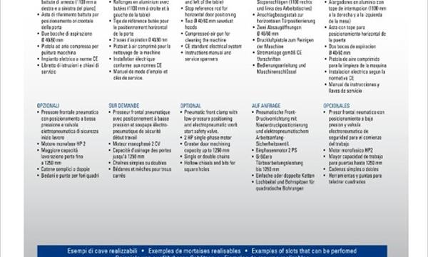 CARATTERISTICHE PRINCIPALI Due diverse lavorazioni: cave tradizionali con l'utilizzo della catena o fori quadri tramite specifico bedano Basamento elettrosaldato ad alta resistenza Testa e carrello in fusione di ghisa Discesa pneumatica della testa per la massima sicurezza, precisione e rapiditΰ di azionamento Scorrimento verticale della testa su pattini a sfere Selettore per la discesa della testa a 2 posizioni Pressore frontale meccanico Apertura rapida del piano per montaggio e lavorazione delle porte Mensola di sollevamento e bloccaggio porta a comando pneumatico DOTAZIONE STANDARD Attacco per utilizzo catena Unitΰ porta bedano per fori quadri Una boccola di riduzione 030,2 mm (1" 3/16) per fissaggio bedano Tre boccole di riduzione 09,5 mm, 6,3 mm, 4,8 mm (3/8", 1/4", 3/16") per fissaggio punte Pompa di lubrificazione automatica della catena Pressore frontale meccanico Discesa automatica della testa Mensola di sollevamento e bloccaggio porta a comando pneumatico Prolunghe in alluminio con battute di arresto (1100 mm a destra e a sinistra del piano) Asta di riferimento battuta per posizionamento orizzontale della porta Due bocche di aspirazione 040/60 mm Pistola ad aria compressa per pulitura macchina Impianto elettrico a norme CE Libretto di istruzioni e chiavi di servizio